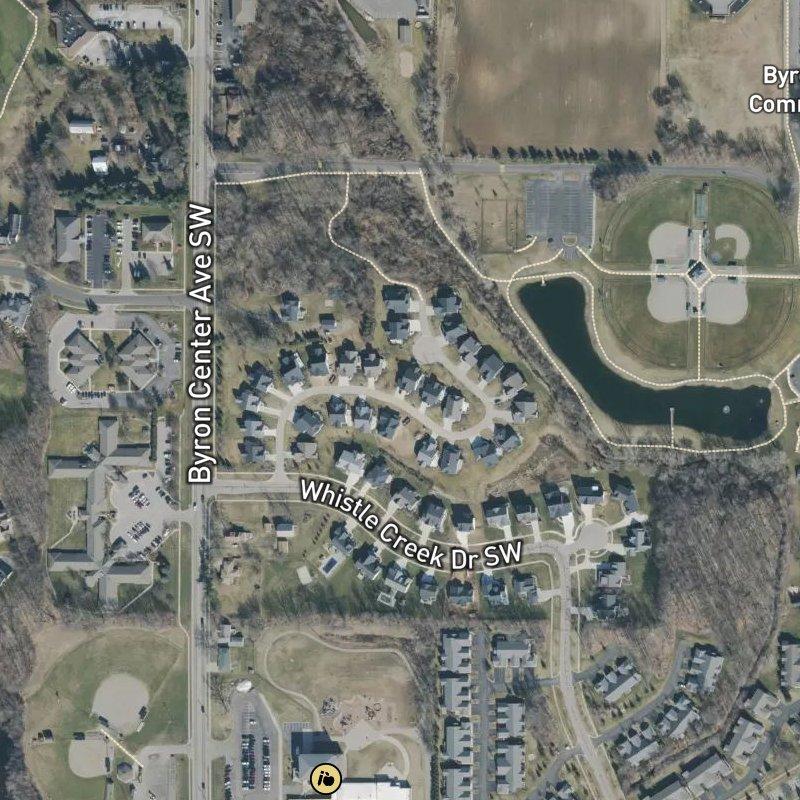 The whole development spans just 10 acres, which means there's genuine density without feeling crowded—homes here run around $816K, and you get actual land to breathe on. What really struck me was how walkable it all is: Byron Township Bicentennial Park is about a seven-minute walk, the nearest restaurant is similarly close, and there are 48 restaurants within a mile if you're not in the mood to cook. The grocery stores and coffee shops are practically neighbors too. You're also right in the pocket between downtown Grand Rapids (17 minutes or so) and Gerald R. Ford Airport (about 20 minutes), so logistics don't feel like a thing you have to think about.
