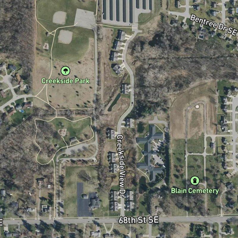 What might surprise you about Villas of Creekside is that it's a completely sold-out development—there's no new construction here, just the 26 duplex ranch-style condos already built among mature trees on a private street. If you're drawn to single-level living with granite countertops, 9- and 10-foot ceilings, and walk-in pantries, you're looking at resale inventory running between $299K and $374K, depending on the floor plan. The real draw, though, is the location: you're 13 minutes from Gerald R. Ford Airport, 17 minutes from downtown Grand Rapids, and literally steps from Creekside Park, where Kent Trails walking paths weave through the green space. The development sits on 13 acres of quiet, wooded ground—privacy without isolation. Restaurants cluster nearby (96 within a mile), and grocery stores, coffee shops, and transit all fall within a 10- to 13-minute walk, so you're not stranded if you don't want to drive every time.