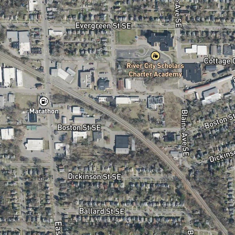If someone asks what Weston & Meigs 4th Add. is, the first thing you'd say is that it's a 13-acre subdivision in Southeast End, sitting eight and a half minutes from downtown Grand Rapids—close enough to the action, far enough back that you're not paying premium prices for the address. The neighborhood runs deep with parks (10 within a mile, starting with Oakdale Gardens just a three-minute walk away), and the nearest transit stop is steps from your front door. A restaurant is a ten-minute walk, the coffee shops and grocers cluster around a mile out, and River City Scholars Charter Academy serves the schools. The subdivision itself spans a modest footprint, but what it lacks in size it makes up for in location—you get the urban-suburban mix that defines Southeast End without the sprawl. Gerald R. Ford Airport is nineteen and a half minutes away if you need it.