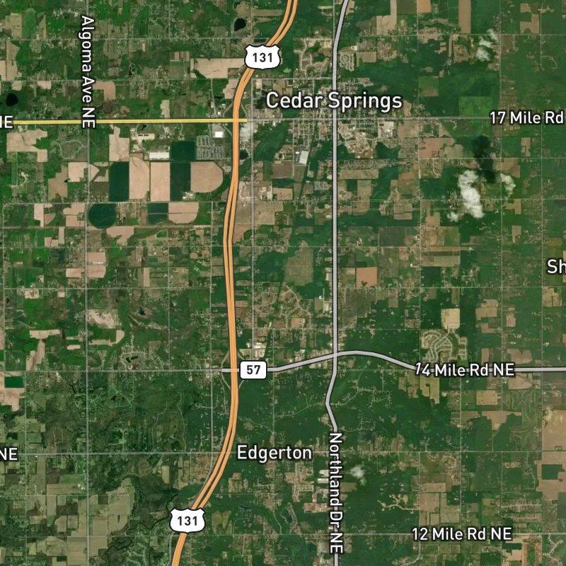 When you roll up to White Creek Ave and US-131, you're met with the hum of the highway and the kind of open space that makes you feel like you're still in the country even though downtown Grand Rapids is just 25 minutes south. The area sprawls across nearly 1,600 acres with a mix of commercial strips and residential corridors that hum along the corridor—there's a grocery within walking distance, and you've got 26 restaurants within a mile if you're hungry right now. Cedar Springs Public Schools serves the area, and homes here run around $395K. The nearest serious outdoor space, Trestle Park, sits about 1.8 miles out, while the Rogue River Launch for boating is 3 miles away if you're looking to get on the water. It's the kind of place where you're close enough to everything that matters without feeling crowded by it.