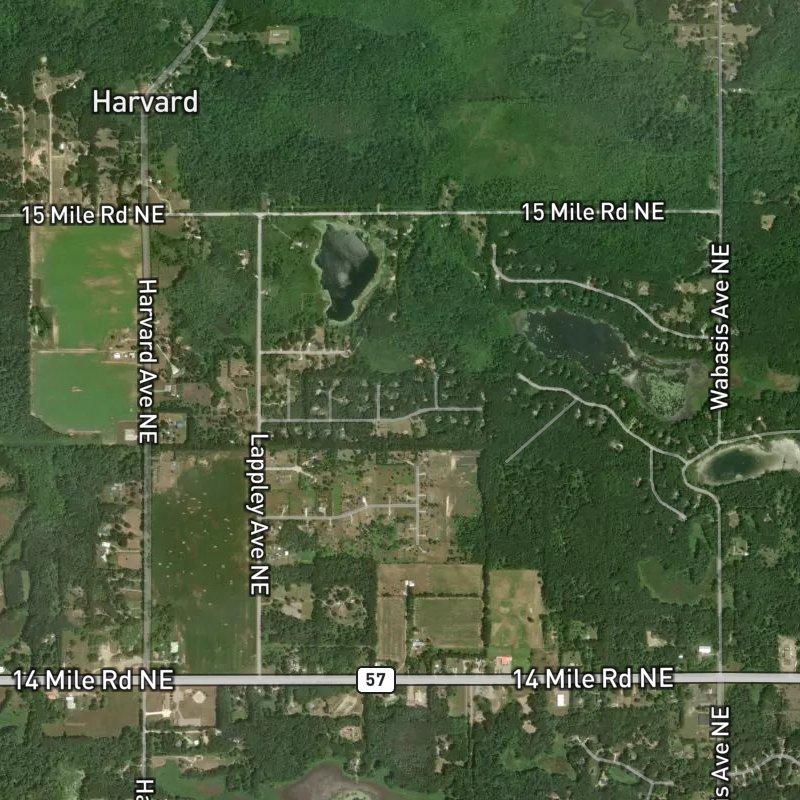 Golden hour hits this place just right—when the afternoon light spreads across 55 acres of wooded lots and the tree canopy turns warm. Each home sits on roughly an acre and a quarter of land, which means you're not living on top of your neighbors; there's actual breathing room between the houses here. About 35 minutes south of downtown Grand Rapids, it's far enough out to feel removed from the city's pull but close enough that you're not making a production of the drive when you need to be there. Homes run around $377K, and the setting gives you the sense that the money went toward space and trees rather than being swallowed by location markup. Students here attend Greenville Public Schools, and the whole development sits within Uneeda Rest Area. Wabasis County Park is just 3.4 miles away—Brown Lake sits even closer at 1.8 miles—so there's genuine access to water and green space without feeling like it's the whole point of living here.
