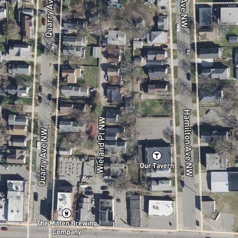 Built as a tight grid of modest homes around 1889, Wieland Add. sits where West Grand spills closest to downtown—a five-minute drive puts you at the heart of the city, though the neighborhood itself feels removed from that rush. Lots here average just over a quarter of an acre, which means front porches face each other across tree-lined streets, and the nearest restaurant is essentially at your doorstep; groceries and a transit stop are equally close, so errands don't require much deliberation. Harrison Park spreads eight minutes on foot, with eight more parks within walking distance, and the Grand River's Fish Ladder lies less than a mile away. Grand Rapids Public Schools serve the area, and homes run around $158K, anchoring the subdivision's working-class roots. The bones here are old—built for factory workers who needed proximity and affordability—and that practical character endures, making it one of the few places near downtown where you can actually live small.