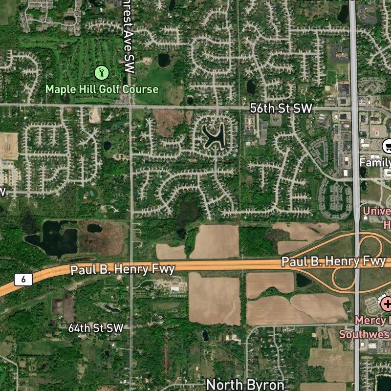 Wildflower Ridge spreads across 61 acres in the Koster South Area, a platted subdivision where homes cluster around a grocery store and coffee shops sitting about a 9-minute walk away—the kind of proximity that actually matters on a Saturday morning. Downtown Grand Rapids lands 16.8 minutes by car, and Gerald R. Ford Airport is 21.3 minutes, which means commuting stays reasonable without feeling like you're in the thick of things. Median prices hover around $460K, positioning the subdivision as a residential pocket within reach of over 130 restaurants and 30 grocery stores scattered across two miles. Grandville Public Schools serves the area, and the nearest park—Gezon Park—sits 1.3 miles out. A transit stop lands about a 10-minute walk away, threading the neighborhood into the region's broader network without making that connection feel forced.