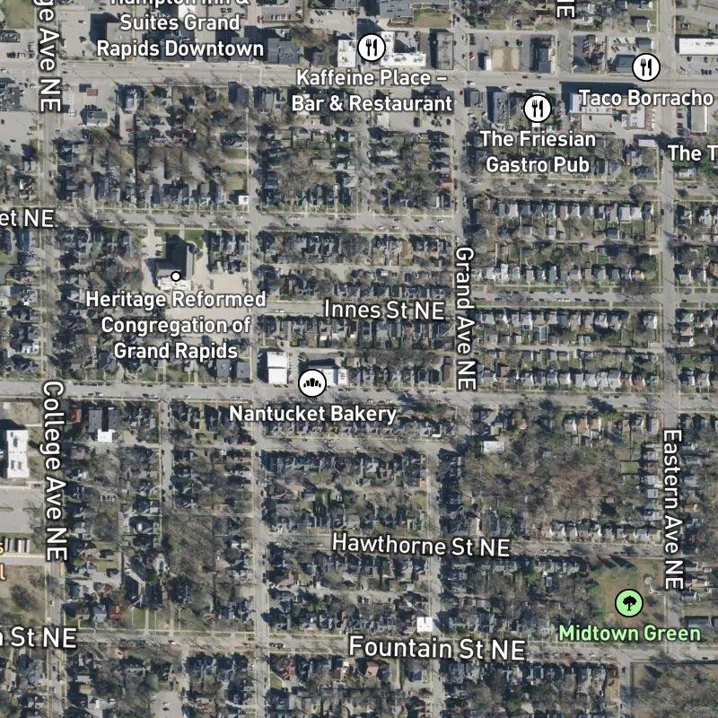 What surprises people about this neighborhood is how much life happens on foot—you're steps from a transit stop, a coffee shop, and some of the city's best restaurants, yet you're also surrounded by 26 parks within a mile and tucked into Midtown, a genuinely walkable part of Grand Rapids. The subdivision itself spans twelve acres of older, well-maintained homes—American Foursquares and Queen Anne Victorians, many over a century old, updated for modern living without losing their character. Homes here run around $370K, and lot sizes average a tenth of an acre, which means you're living close to neighbors in a dense, walkable grid rather than spreading out.