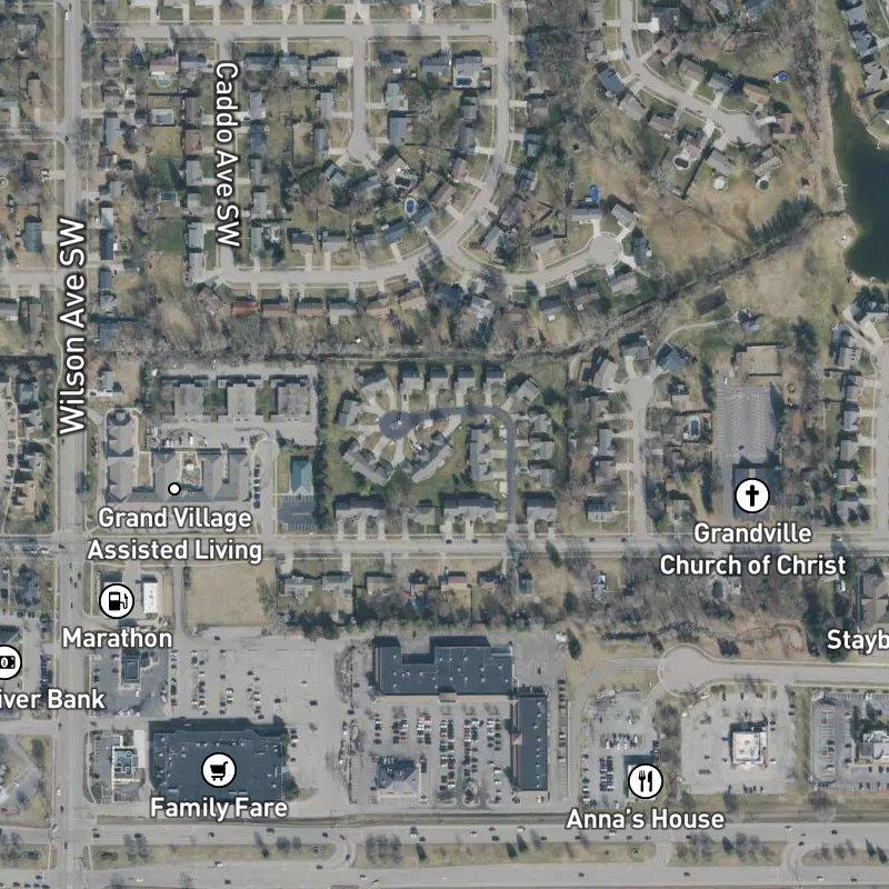 Woodcrest Circle sits on the western edge of the Vredevoogd Plat Area, where strip malls give way to residential pockets and you can still see open sky. The 7-acre development has a transit stop practically at its doorstep, which is handy if you're headed downtown Grand Rapids (16 minutes away) or the airport without wrestling with parking. What actually matters more day-to-day: a grocery store and a couple of restaurants are a two-minute walk, and there are 216 restaurants within a mile if you're not feeling creative with your pantry. Coffee requires a bit more ambition—14 minutes on foot—but Grandville Public Schools anchors the broader area, and Heritage Park is a reasonable trek for when you need to get outside.