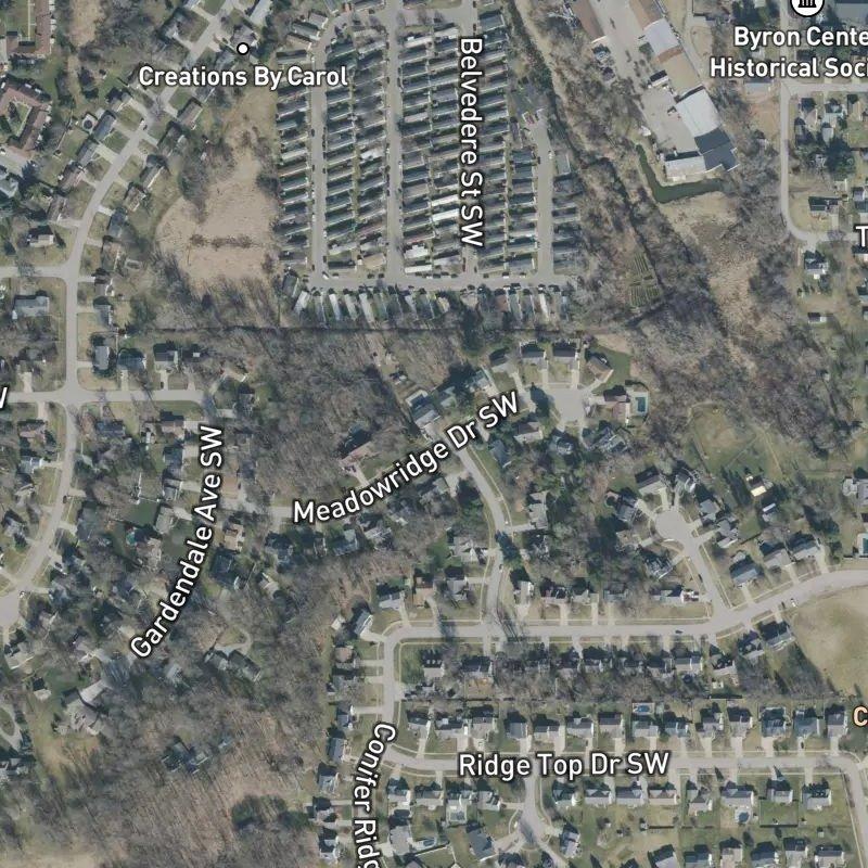 Late afternoon light hits this twelve-acre subdivision best, when the newer homes catch that golden hour glow across the modest lots. Woodmeadow Estates sits in the Marlo Farms Area, a platted community where homes average around $460K and sit on just under half-acre parcels — enough space to feel grounded without the sprawl. You're twenty minutes from downtown Grand Rapids, and a coffee shop is nine minutes on foot, with forty-two restaurants clustered within a mile if you're tired of cooking. The Byron Center Public Schools district covers this area, and Byron Township Bicentennial Park runs about fourteen minutes walk from here. Gerald R. Ford Airport sits twenty-three minutes south if you travel regularly.