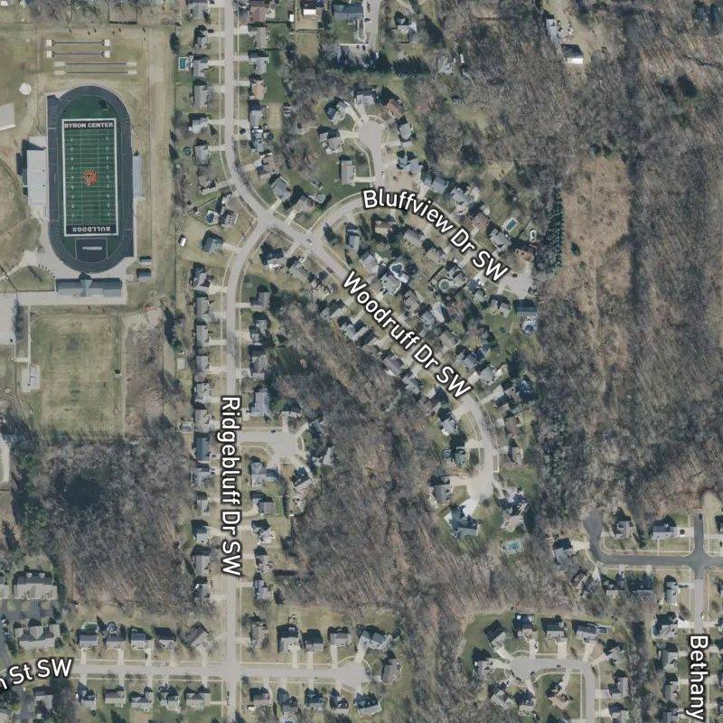 You'll notice the lots right away—they're generous, tree-lined, and spread across 30 acres in a way that actually gives you room to breathe without feeling remote. Woodruff Estates sits in the Marlo Farms Area with straightforward access to downtown Grand Rapids in about 18 minutes, and the airport is roughly 22 minutes out, which keeps things convenient without any highway hassle. A grocery store is about a 6-minute walk, and there are 42 restaurants within a mile, ranging from quick stops to places worth the drive, so you're not hunting far for dinner. Byron Township Bicentennial Park sits less than a mile away if you want green space without leaving the area, and Byron Center Public Schools serves the subdivision. What really anchors this place is the land itself—the lots have actual breathing room, and the mature trees make it feel established rather than freshly platted.