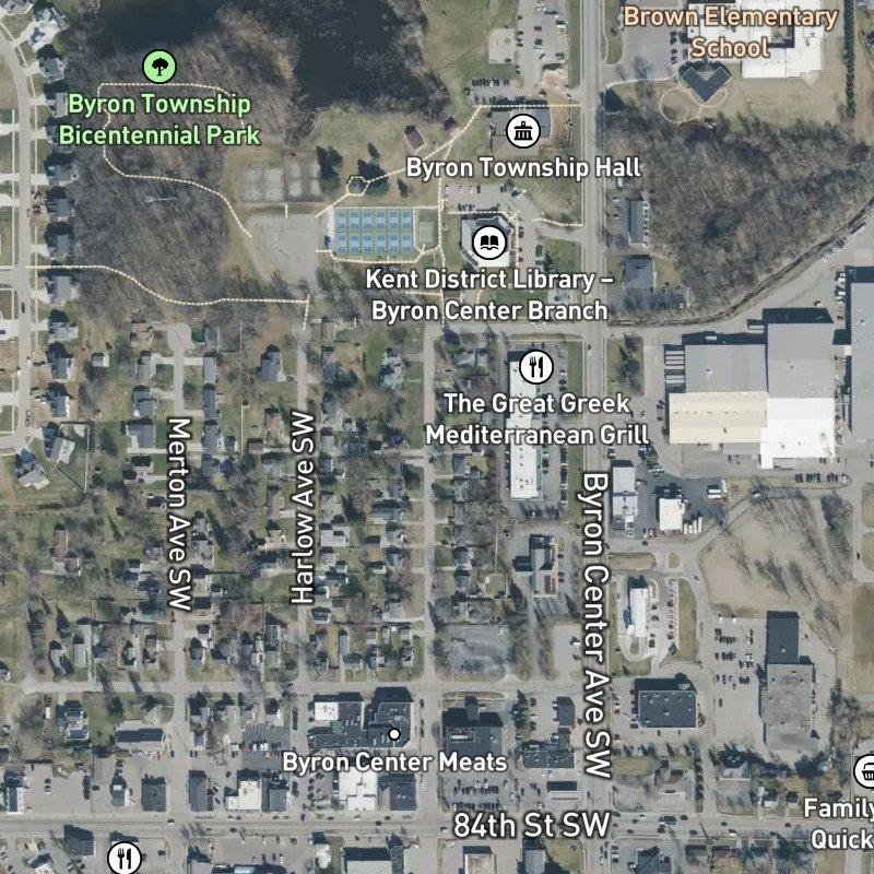 Wustman Plat sits on 6 acres in the Byron Oaks No. 2 Area, where you're steps from a coffee shop or restaurant whenever the mood strikes—48 of them within a mile, in fact. The nearest grocery is a 4-minute walk, and Byron Township Bicentennial Park is equally close if you need actual grass. Byron Center Public Schools serves the subdivision. Downtown Grand Rapids is 18 minutes away by car; Gerald R. Ford Airport, 21 minutes. Homes run around the mid-$200s to low-$300s range, and the walkability here is genuinely strong for errands and dining—you won't need to drive for coffee or takeout. Three parks within a mile means outdoor space isn't a distant promise.